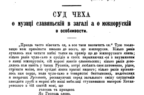 Однакож „правда часто нівечить ся, а все таки визначить ся“. Краса нашого язика, яко язика народа мешкаючого в самім осередку земель славяньских, мовби в серци Славянщини, язика пребогатого, милозвучного и помежи всіми славяньскими орґанічно найвисше розвитого, хоть и довго запізнавана, в новійших часах найшла прецінь узнанє учених філололґів славяньских, а гадка, яку прорекли мужі глубокоі науки, згодом-перегодом почала ділати на загал, на вкорінені пересуди, розьяснюючи мов передсвіт темную мраку... А так, відай, єще и в наше віконце заблисне колись сонце, відай лучша дoля ожидає наш язик, а грядущі віки дивоватимуть ся, як міг язик такий красний пак довго бути в занедбаню и запустіню. Як би и упостачувались обставини, в нас увіренє кріпке, що недалекий може вже час, коли наша Русь южна буде предметом пильних студий у всіх Славян. Доселі однакож стрічали-сьмо — з немногими висмками — досить байдужести у Русинів до свого ріднёго, а у племен нам посвоячених, именно у сусідуючих з нами, богато недовіря ба навіть ворогуваня до всего, що зве ся южноруским. Тим приятнiйше вражiне зробила на нас статя п. Макса Кононаска, поміщена в „Нudebnich Listech" (Листах про музику) за р. 1874, а також и оцінка тоi статьі поміщена в ческім письмі „Svĕtozor“ р. VIII. 1874, де висказуєсь великоі досяглости правда и подає объєктивно осуд нашоі народнёі южнорускоі музики.