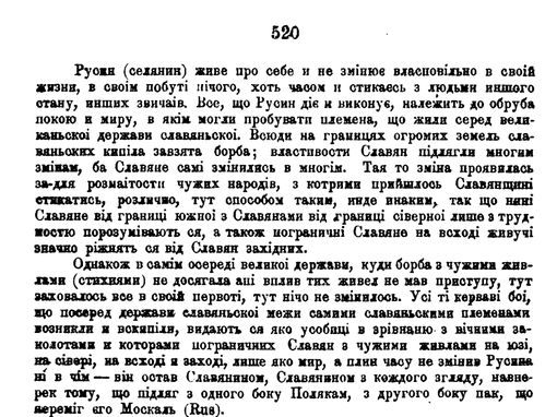 Однакож в самім осереді великоі держави, куди борба з чужими живлами (стихиями) не досягала ані вплив тих живел не мав приступу, тут заховалось все в своій первоті, тут нічо не змінилось. Усі ті керваві бoі, що посеред держави славяньскоі межи самими славяньскими племенами возникли и вскипіли, видають ся яко усобиці в зрівнаню з вічними за колотами и которами пограничиих Славян з чужими живлами на юзі, на сівері, на всході и заході, лише яко мир, а плин часу не змінив Русина ні в чім — він остав Славянином, Славянином з кождого згляду, навне рек тому, що підляг з одного боку Полякам, з другого боку пак, що переміг єго Москаль (Rus).